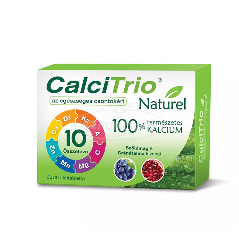 Az új CalciTrio Naturel filmtabletta 100%-ban természetes kalciummal támogatja a csontok egészségét. A készítmény 10 féle összetevőt tartalmaz: számos vitamint, ásványi anyagot és nyomelemet, melyek segítik az egészséges csontozat fenntartását, ezen felül még gránátalma és szőlőmag kivonatot.